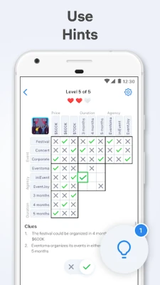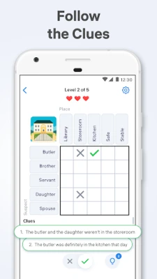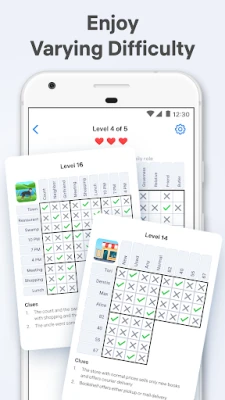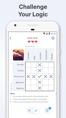 在 Logic Puzzles 的每一个挑战中,你的目标是通过有限的线索,巧妙地填充逻辑网格,揭示隐藏的真相。游戏的核心在于其直观而深刻的玩法:你将从一系列看似零散的提示中抽丝剥茧,运用排除法和纯粹的逻辑推理,逐步排除不可能的选项,直到所有参数完美匹配。每一次成功的推理,都像点亮一盏灯,照亮谜题的每一个角落。这不仅仅是填表格,更是一场智力的博弈,让你体验从迷茫到豁然开朗的独特乐趣。